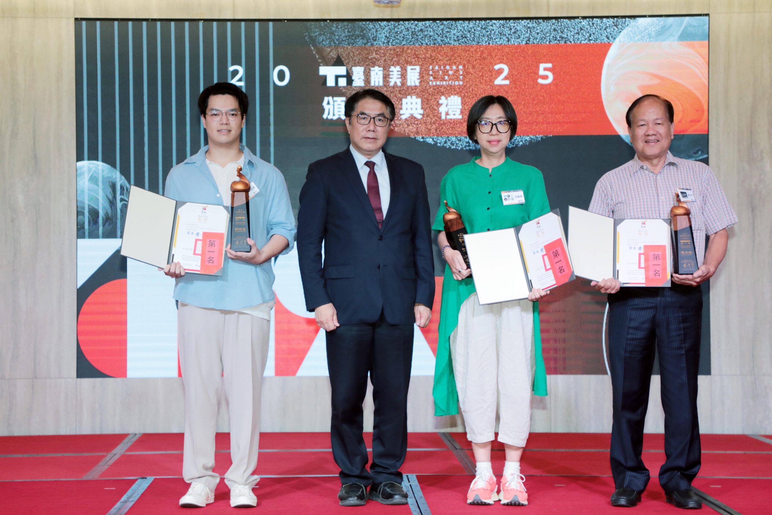 本屆美展的最高榮譽「台南獎」,由3位傑出藝術家獲得:書法類由蔡玉蓮以細膩筆法脫穎而出;東方媒材類由陳婕宜運用獨特媒材表現東方美學;而立體造型類則由龍美君以獨特觀點與精湛工藝拿下殊榮。他們的作品不僅展現高超的藝術技巧,更融入當代視角與文化深度,呈現台南藝術的多元風貌。