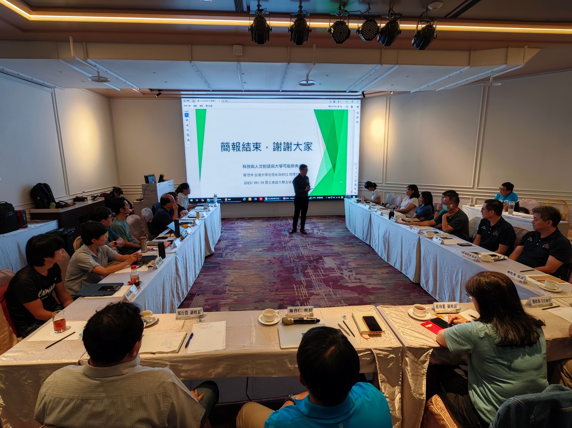 會中特別邀請台灣大學特聘教授簡旭伸發表演講,以「科技與人文對話」為題,剖析AI、大數據及氣候變遷等挑戰,如何驅使大學進行跨領域合作。他強調,高等教育應肩負起「知識公共性」的責任,成為社會創新的平台,從政策討論、在地實踐到國際合作,全面展現其影響力。