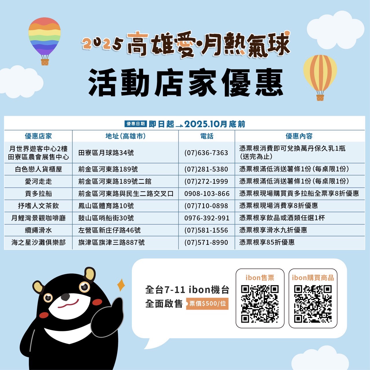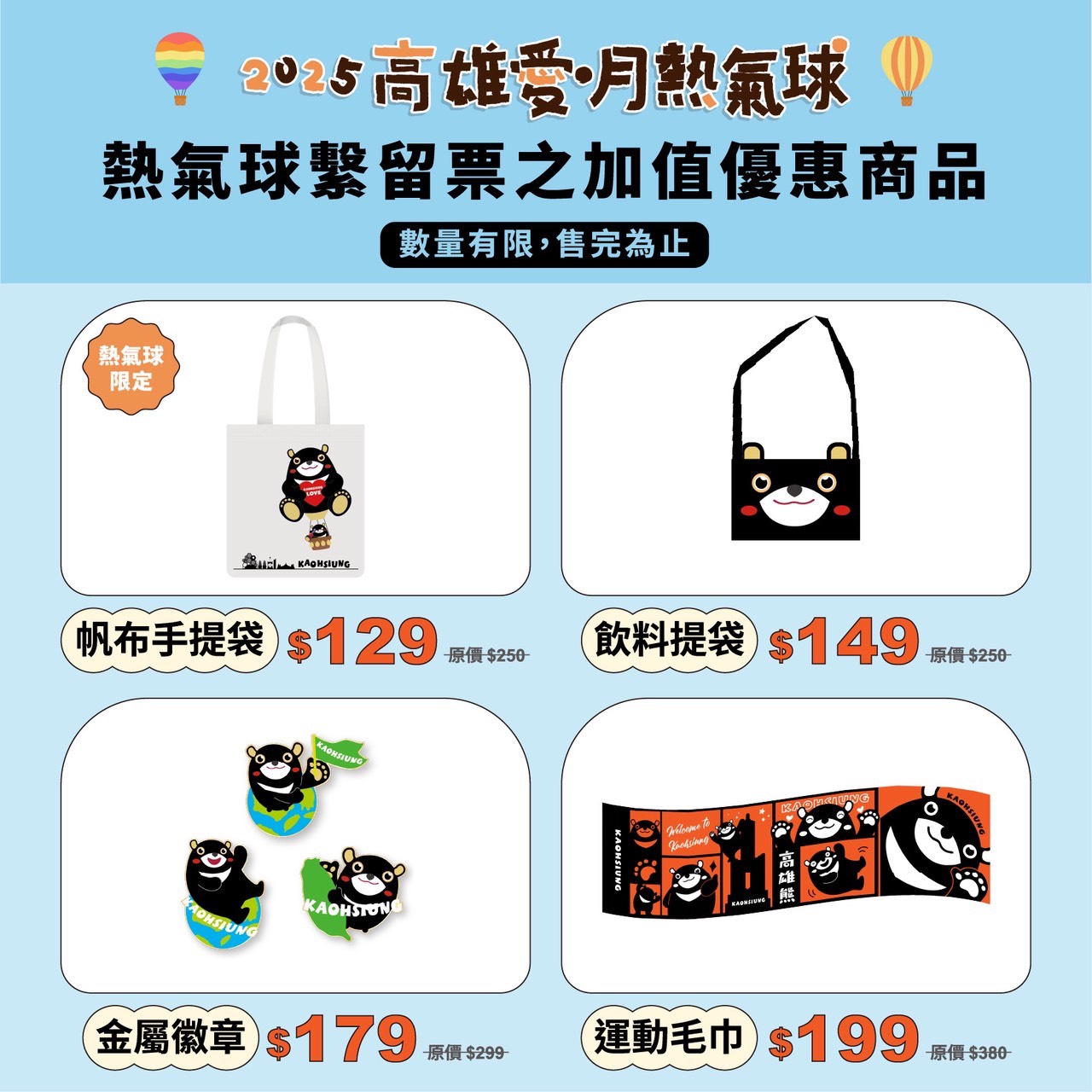 除了熱氣球繫留體驗,觀光局今年更推出「高雄熊熱氣球帆布袋」等限量主題商品,包括熊熊飲料提袋、金屬徽章與運動毛巾,可透過ibon或現場購票以優惠價加購收藏。