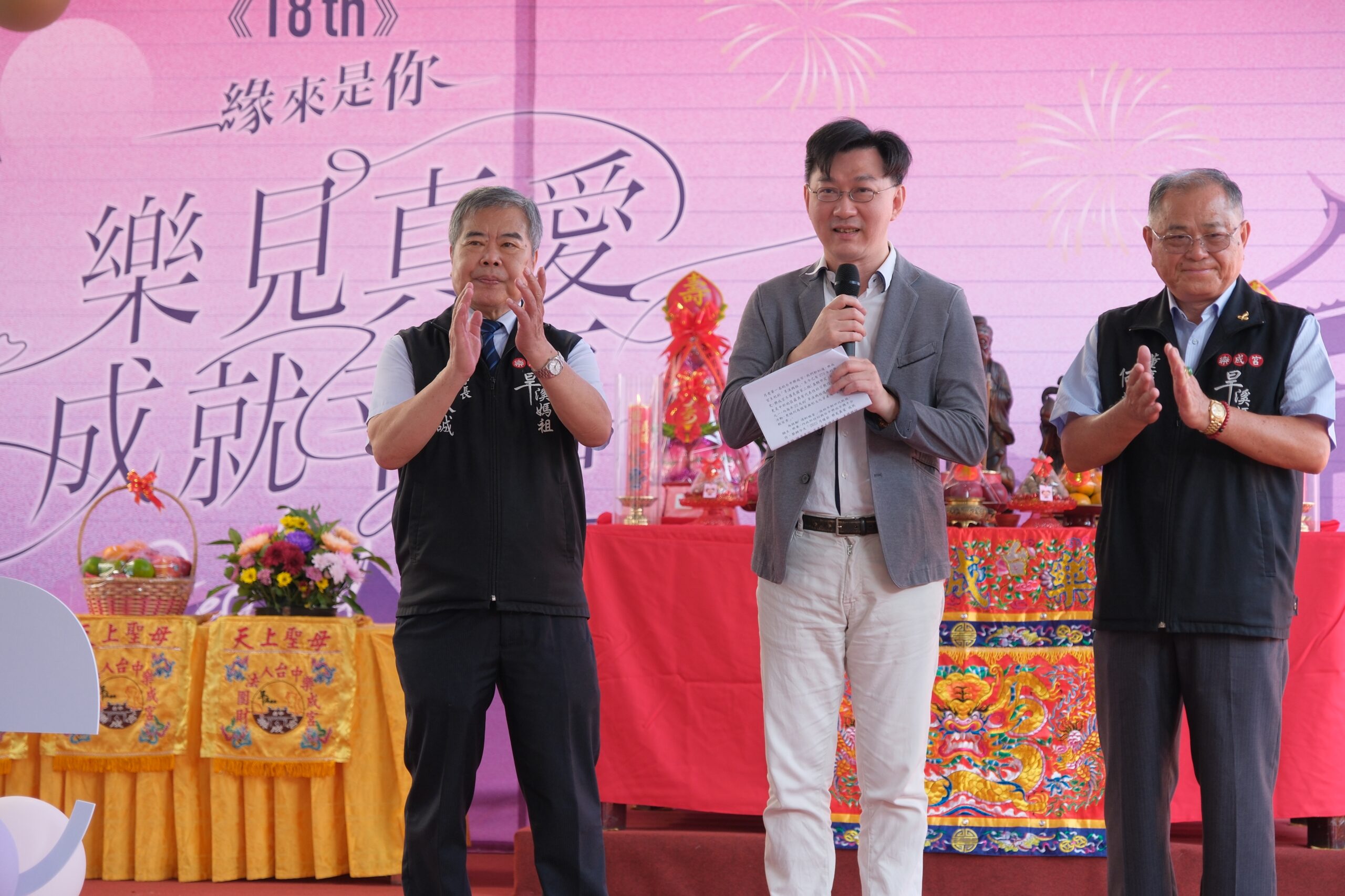 活動由內政部政務次長董建宏與台中樂成宮董事長何敏誠共同揭開序幕。立法委員何欣純、羅廷偉、立法院副院長江啟臣服務處秘書、台中市政府民政局副局長陳寶雲也一同出席,帶領現場青年朋友進行莊重的祈福儀式,為他們的愛情之路送上最誠摯的祝福。
