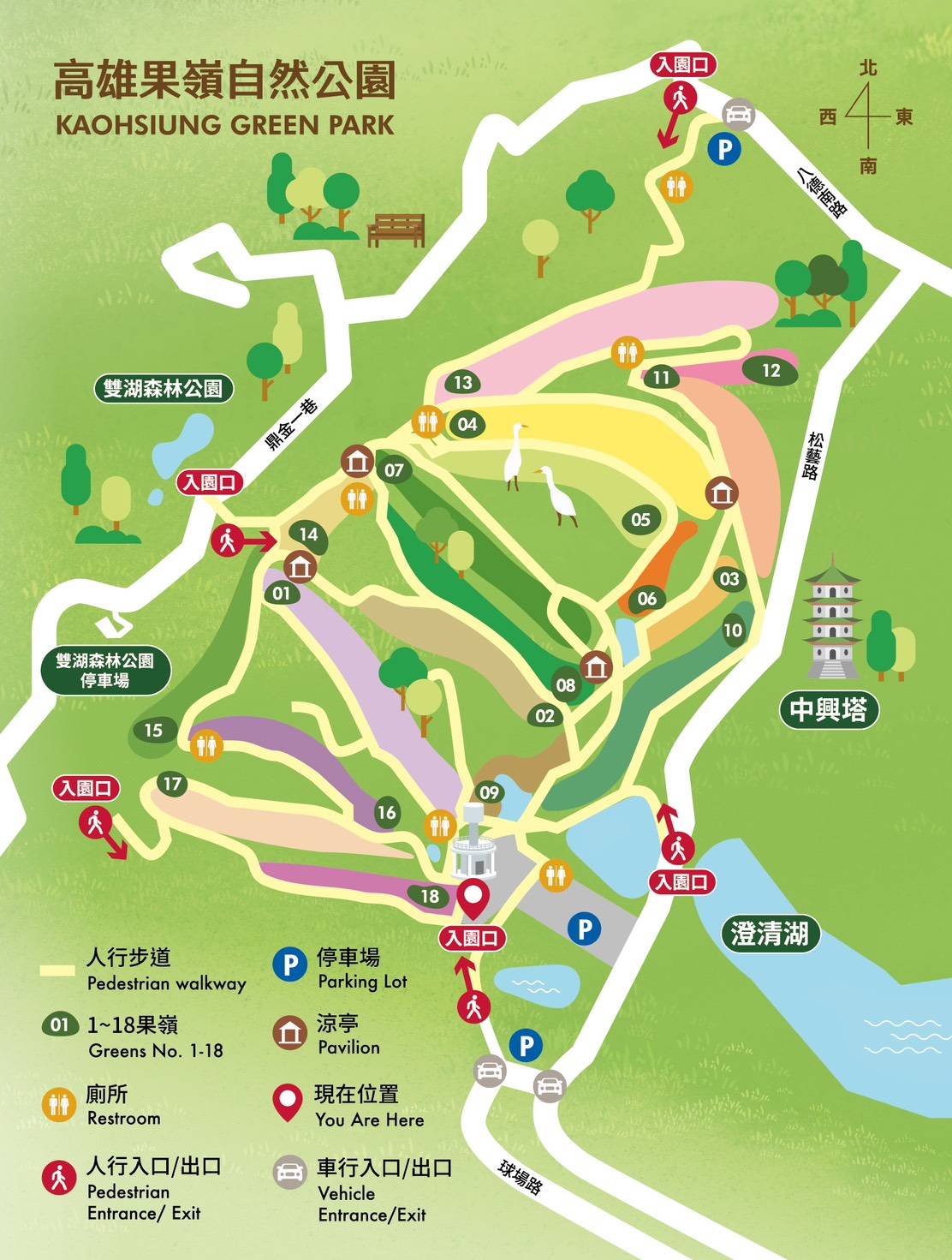 這片過去受限於球場用途的土地,經市府依法收回與整備後,已全面轉化為人民共享的空間。公園依循原十八洞球道重新規劃,呈現多樣化的生態景觀與休憩環境:您可以看到一號果嶺荷花池花葉交織、水鳥悠遊;在十五號果嶺稜線高地則常見大冠鷲盤旋;十八號果嶺的舊發球台已改建為觀景平台,可遠眺北大武山與柴山;而十號果嶺景觀湖畔以落羽松與湖水倒影交織,已成為最具人氣的拍照打卡亮點。