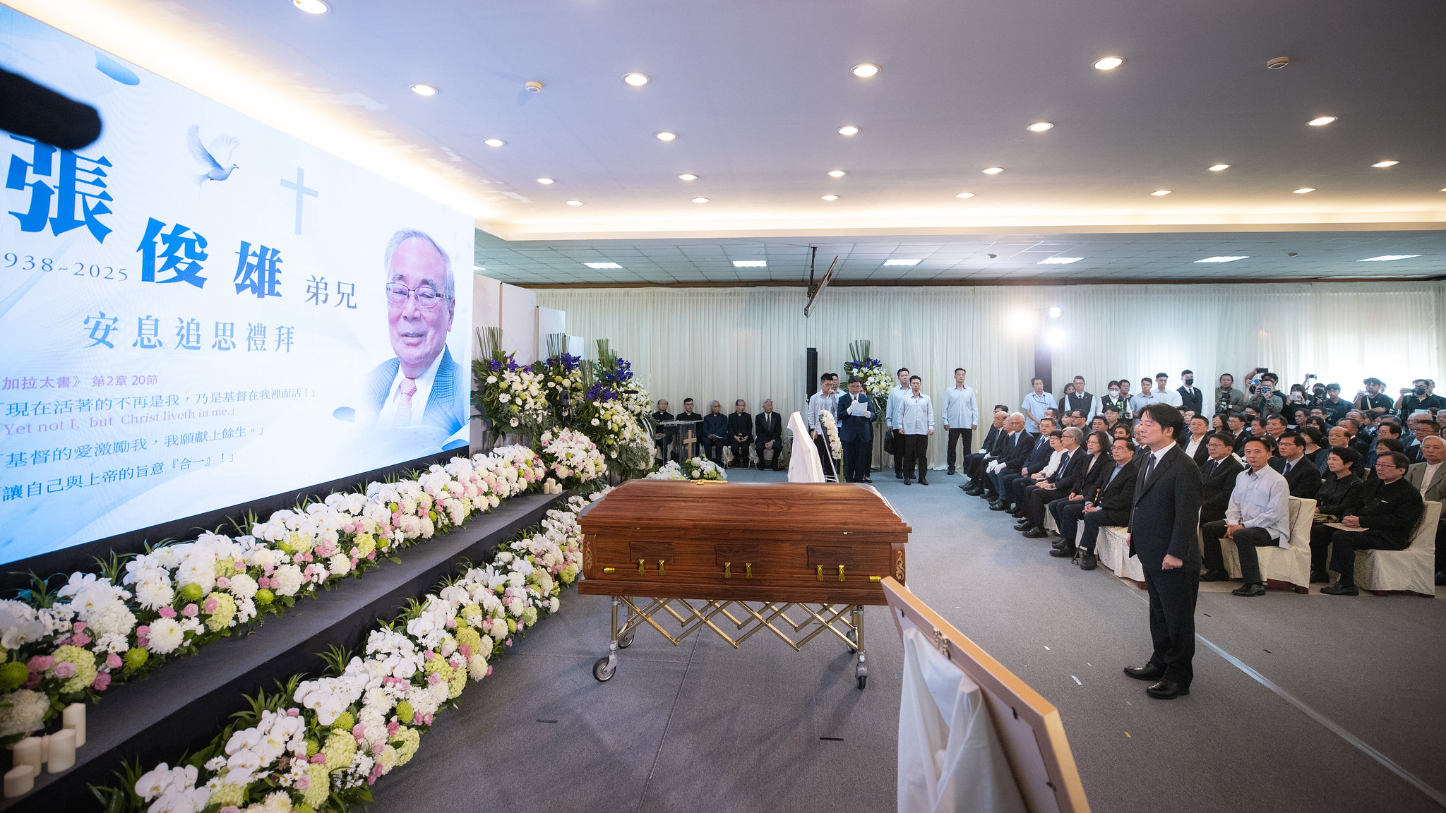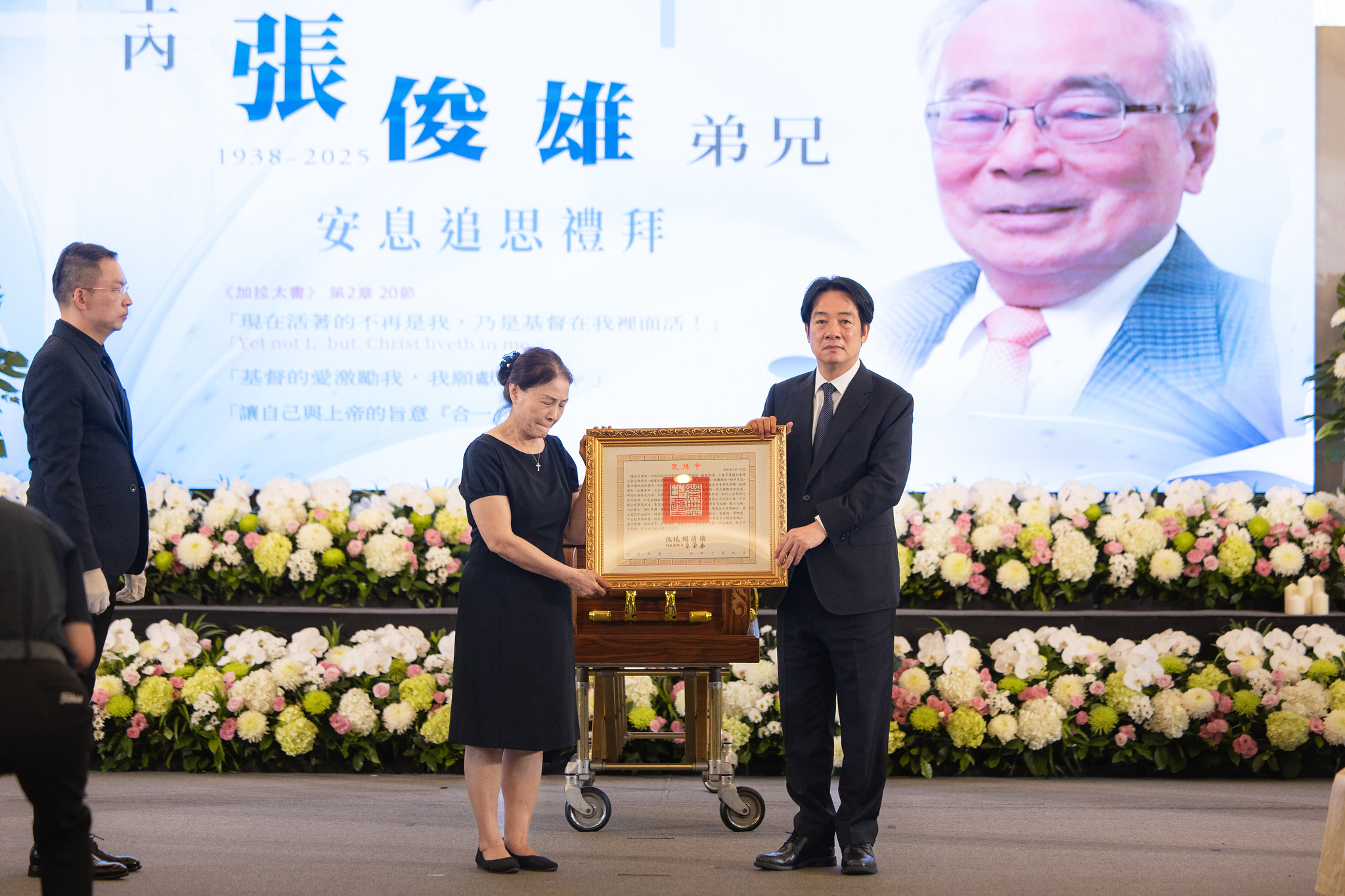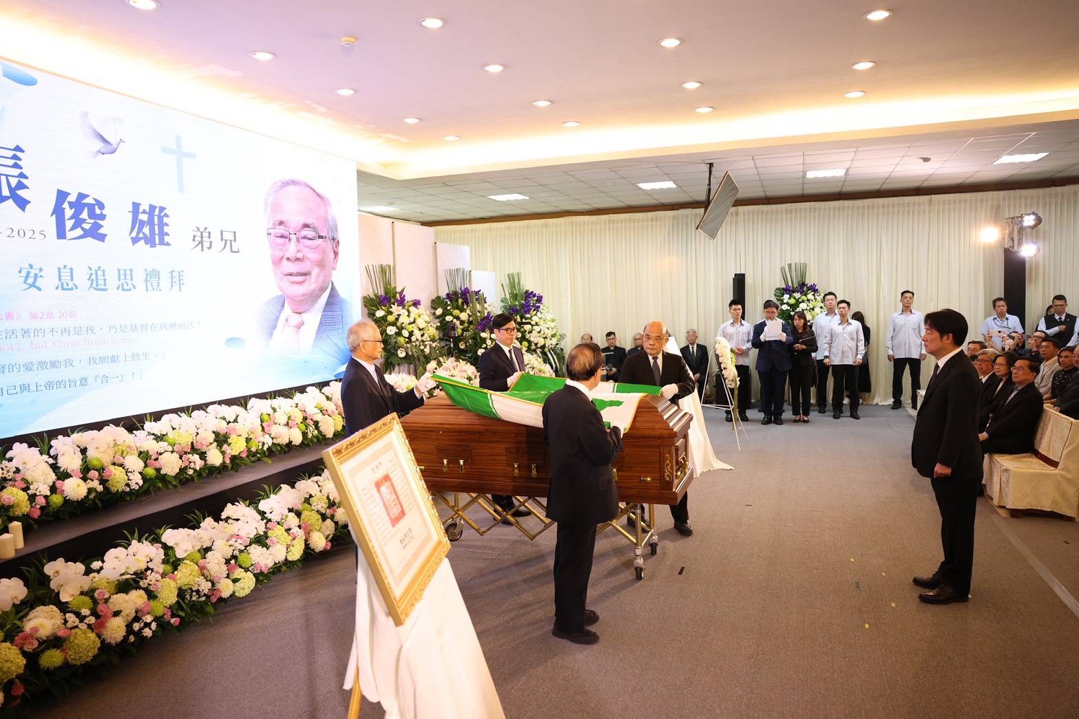 賴清德總統以《聖經》彌迦書「行公義、好憐憫、存謙卑的心,與神同行」回顧張俊雄前院長一生,並引用《提摩太後書》的經文:「那美好的仗,你已經打過了;該跑的路程,你已經跑盡了;當守的信仰,你也已經持守。」表達對其離世的不捨與感念,並頒發褒揚令,表彰其對國家、社會、人民的卓越貢獻,願其安息主懷。