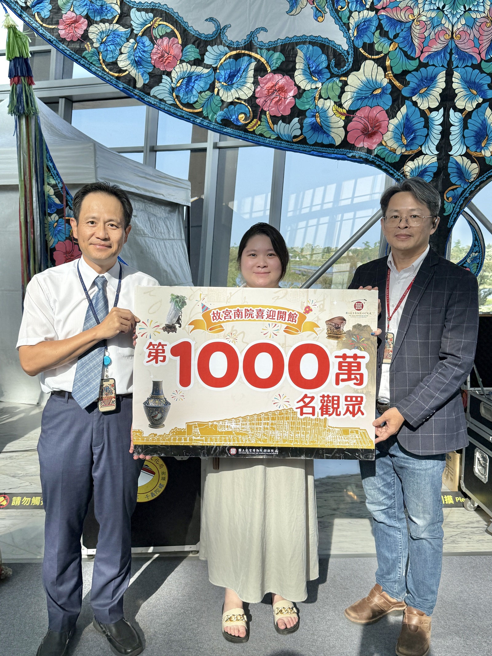 故宮主任秘書王耀鋒親自致贈精緻禮品,除了羅小姐,來自江蘇的第9,999,999名觀眾董先生,以及第10,000,001名來自台中的吳小姐也同時獲獎,3位觀眾均感到十分驚喜,不僅認為值回票價,更一同恭賀故宮南院10週年快樂。
