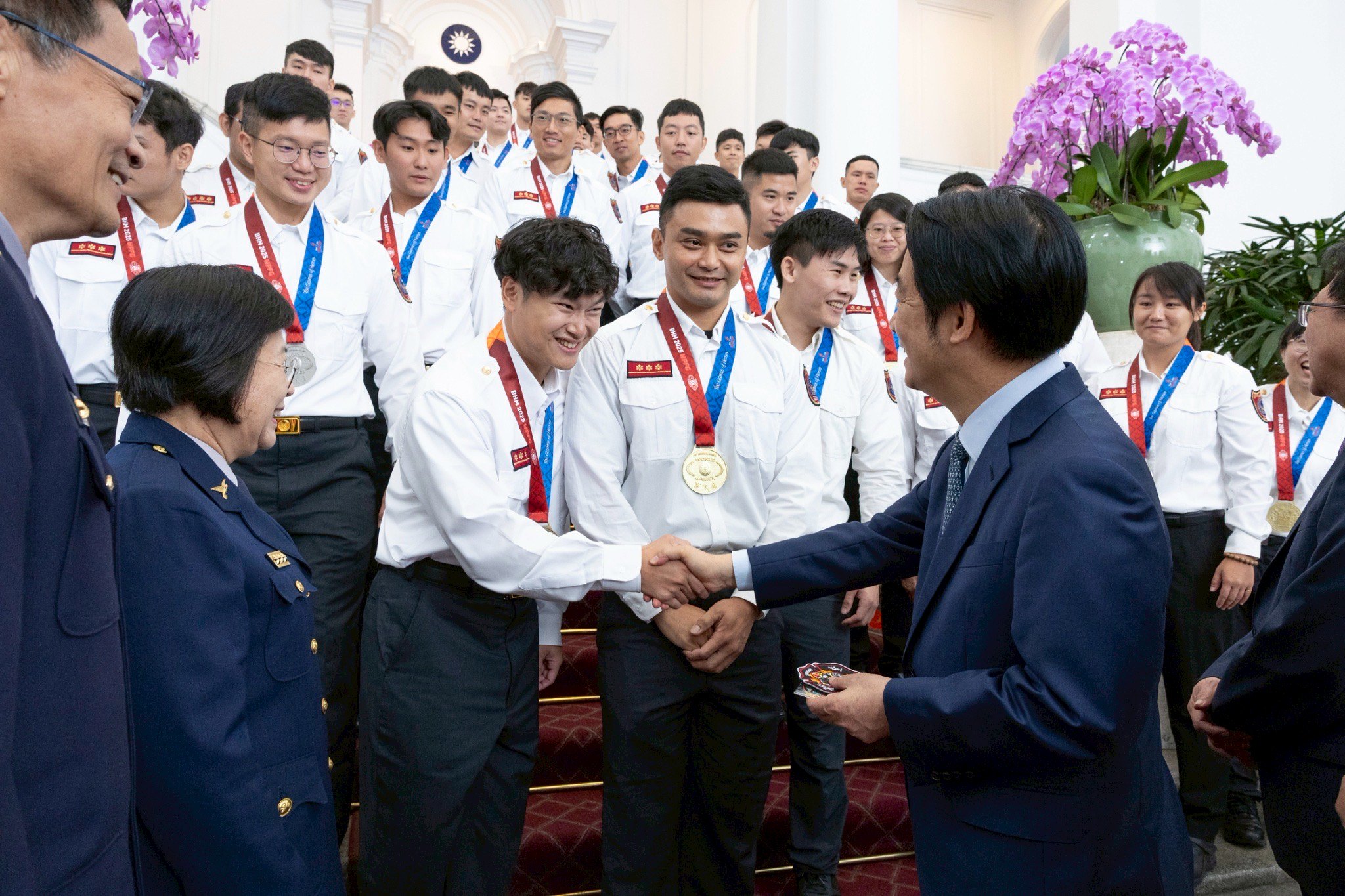 總統賴清德今(27)日上午在總統府接見「2025年第21屆世界警察消防運動會」台灣代表團,盛讚警消同仁在有「警消界奧運會」之稱的賽事中,勇奪74金、46銀、48銅,總計168面獎牌,一舉創下台灣代表隊歷屆最好成績,充分展現「台灣尚勇」的專業精神與實力。