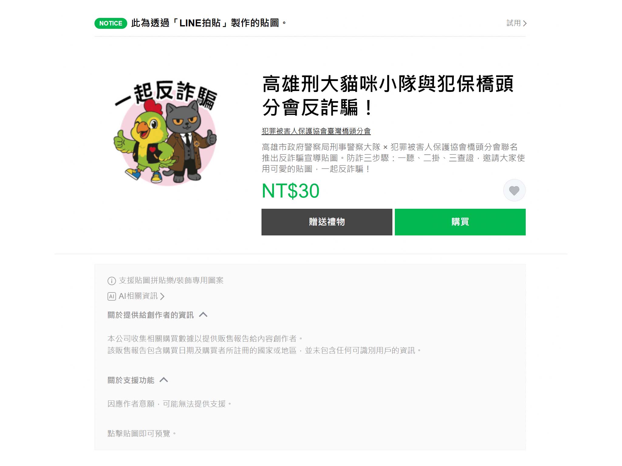 強化全民反詐騙意識,高雄市政府警察局刑事警察大隊與橋頭地方檢察署、犯罪被害人保護協會橋頭分會跨界合作,正式發表「刑事貓咪小隊」反詐騙 LINE 貼圖。將嚴肅的反詐警示轉化為日常通訊語彙,期盼藉由數位工具提升民眾的警覺性。該貼圖所得收益將全數捐贈予犯罪被害人保護協會,落實公益關懷與預防宣導並行。