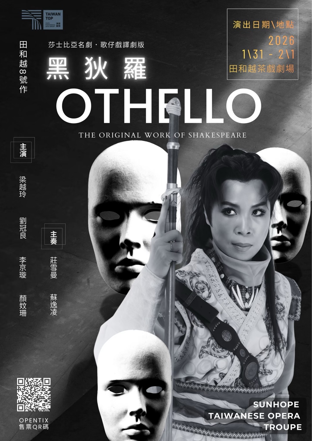 當傳統歌仔戲遇上莎士比亞的悲劇靈魂,會擦出什麼火花?尚和歌仔戲劇團將於 1 月 31 日至 2 月 1 日,在高雄田和越茶席劇場推出改編自《奧賽羅》的新作《黑狄羅》。由金曲獎得主李哲藝與編劇梁越玲聯手,透過琵琶與大提琴現場演奏,結合沈浸式茶席空間,帶領觀眾近距離感受人性在愛與猜忌間的糾裂。