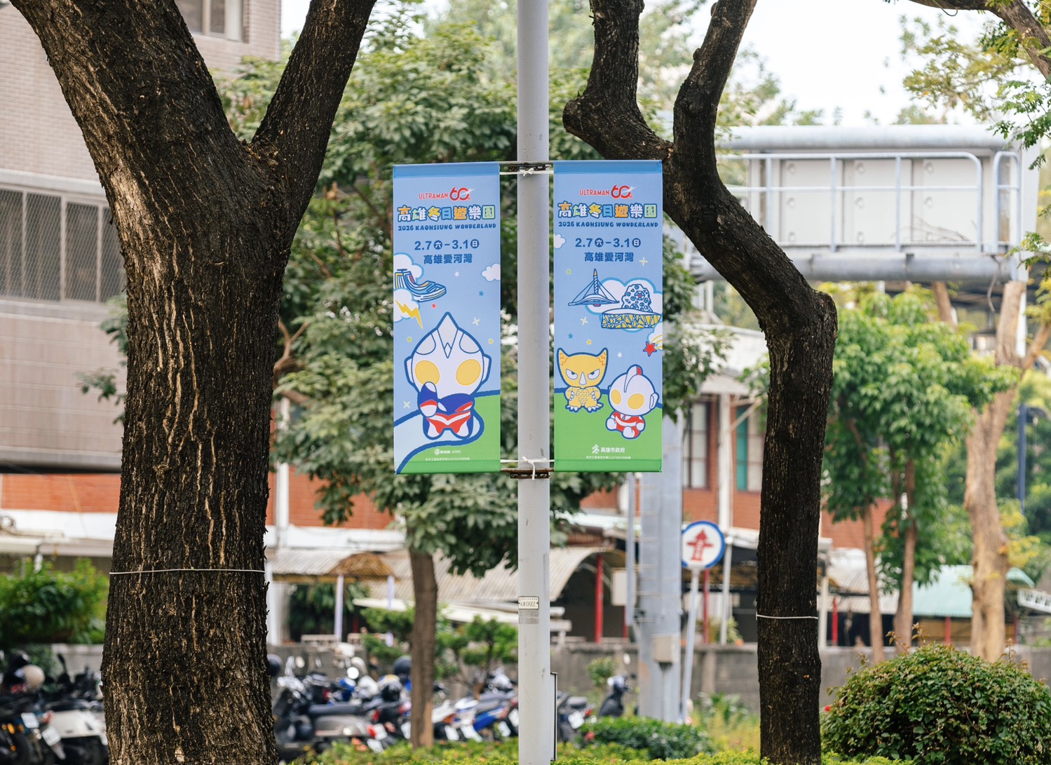 除了移動式的交通載具,本次活動也將視覺延伸至城市靜態空間。市府於高雄市區重要幹道與觀光節點設置主題路燈旗,並在多處公車候車亭也看得到超人力霸王,讓市民與觀光客在等車、行走間也能感受到活動氛圍。透過這種點、線、面的佈局,試圖將整座城市轉化為大型的主題展場。