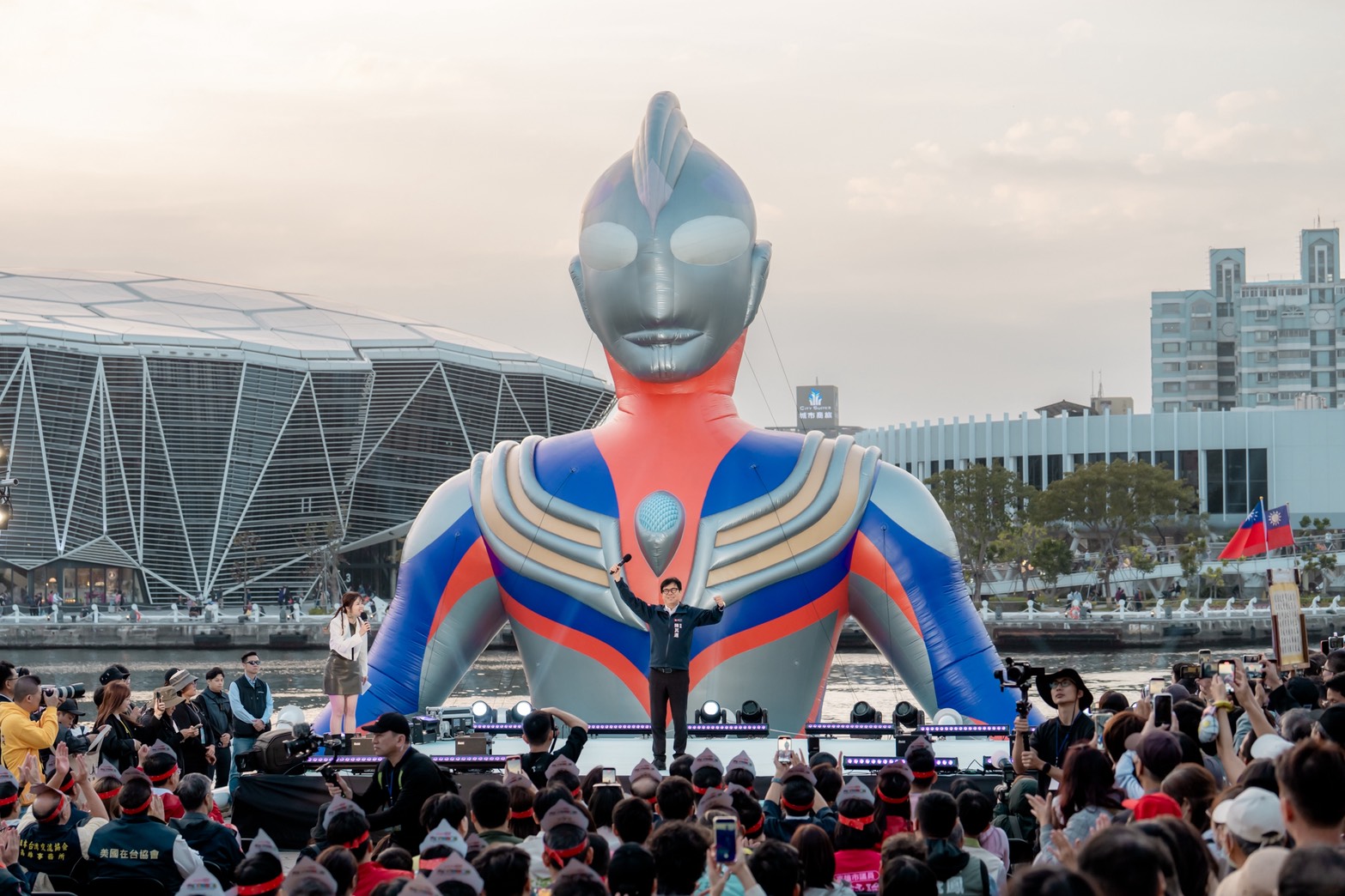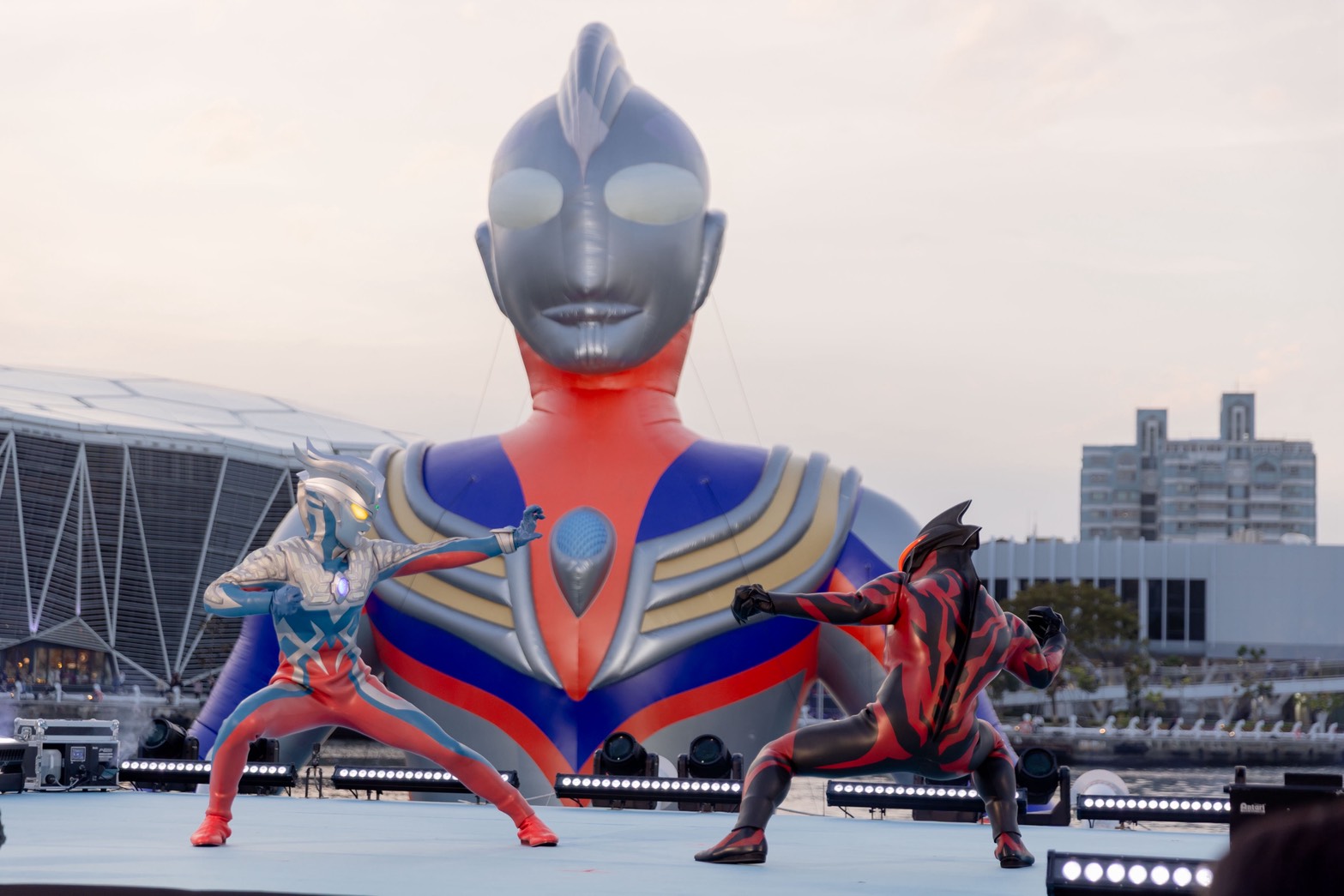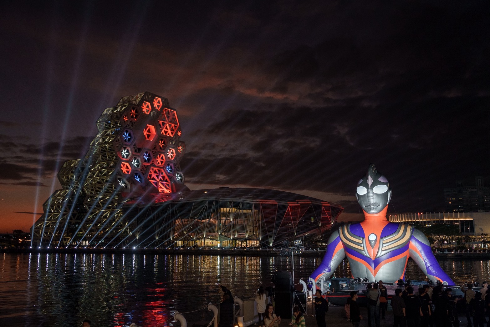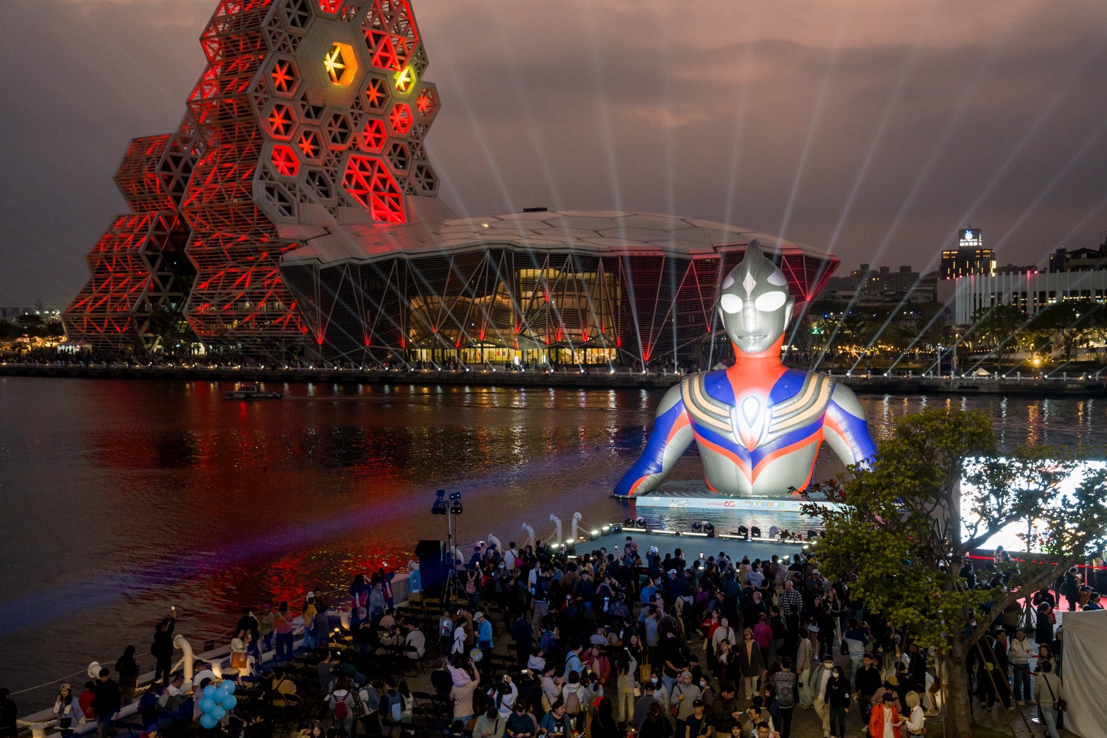 繼黃色小鴨與吉伊卡哇之後,高雄市府持續利用港區空間推動國際 IP 合作,成功將城市港灣形塑為全民共享的遊憩舞台。今年適逢超人力霸王(Ultraman)問世 60 週年,這項跨世代的英雄文化成為本屆遊樂園主題,兩座 15 公尺高的巨型裝置(初代、迪卡)分別聳立於高雄流行音樂中心音浪塔及珊瑚礁群,成為愛河灣的新地標。