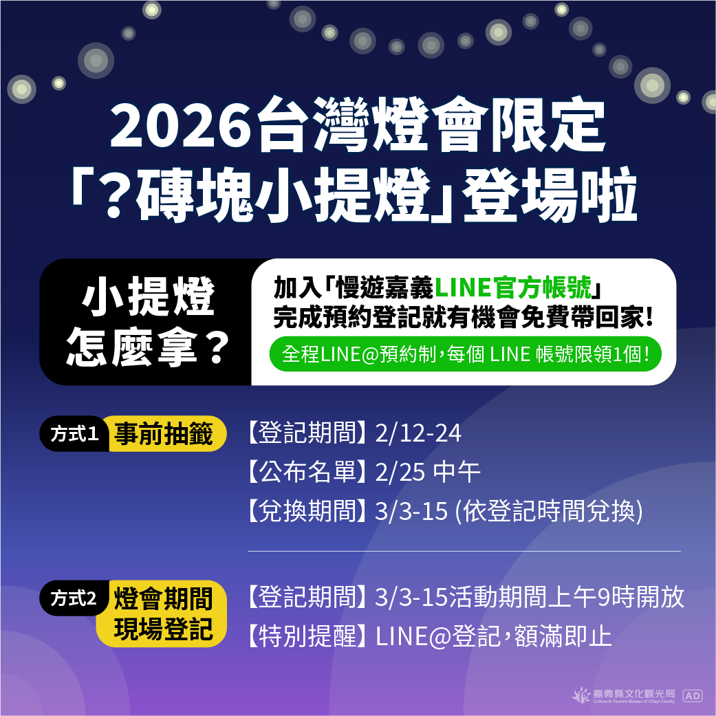 嘉義縣政府文化觀光局提醒,有計畫觀賞燈會的民眾應儘早完成LINE帳號綁定,提前完成預約規劃行程,把握參與2026台灣燈會及收藏限定「?磚塊小提燈」的機會。
