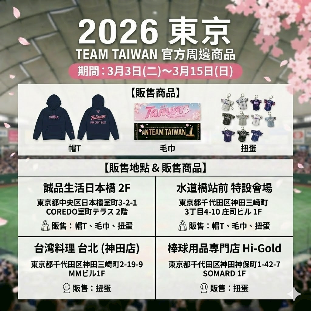為了讓球迷能以最快速度搶購到限量周邊,一卡通將販售點精準鎖定在東京熱門區域。球迷可直接前往「誠品生活日本橋」2F或「水道橋站前特設會場」購買全品項官方授權商品。另外,在「台灣料理 台北」神田店與棒球用品專門店「Hi-Gold」則設有特色扭蛋機。一卡通表示,透過科技整合,就是要讓台灣球迷在感受緊張賽事的同時,不僅能把應援熱情感染到球場之外,還能最便利地搶購限量裝備,力拚讓TEAM TAIWAN的應援聲量席捲全日本。