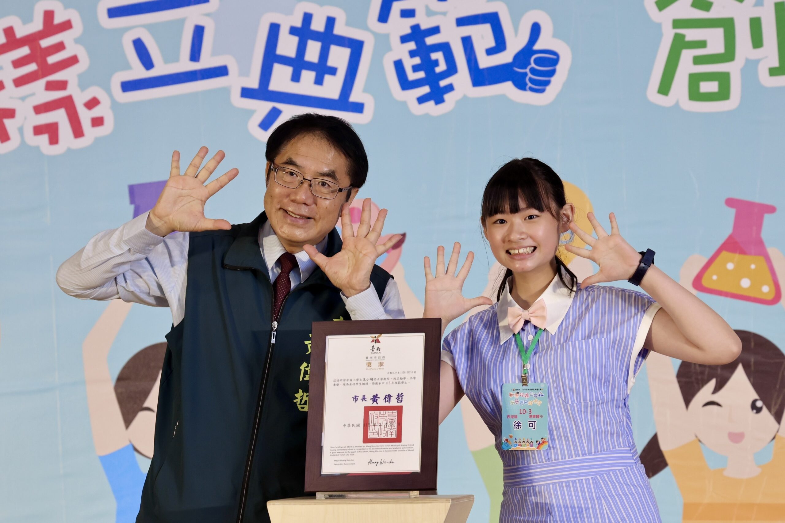 黃偉哲指出,獲選模範生不僅是個人榮耀,更是家長與師長共同耕耘的成果。他認為,在全球化的挑戰,優秀學子不僅是為個人、家庭或城市努力,更肩負著未來對人類做出貢獻的使命。他期許學子在進入國中新階段後,能在德智體群美五育中持續精進,將個人潛能轉化為守護社會的堅實棟樑,勇敢迎接為他們敞開的世界舞台。