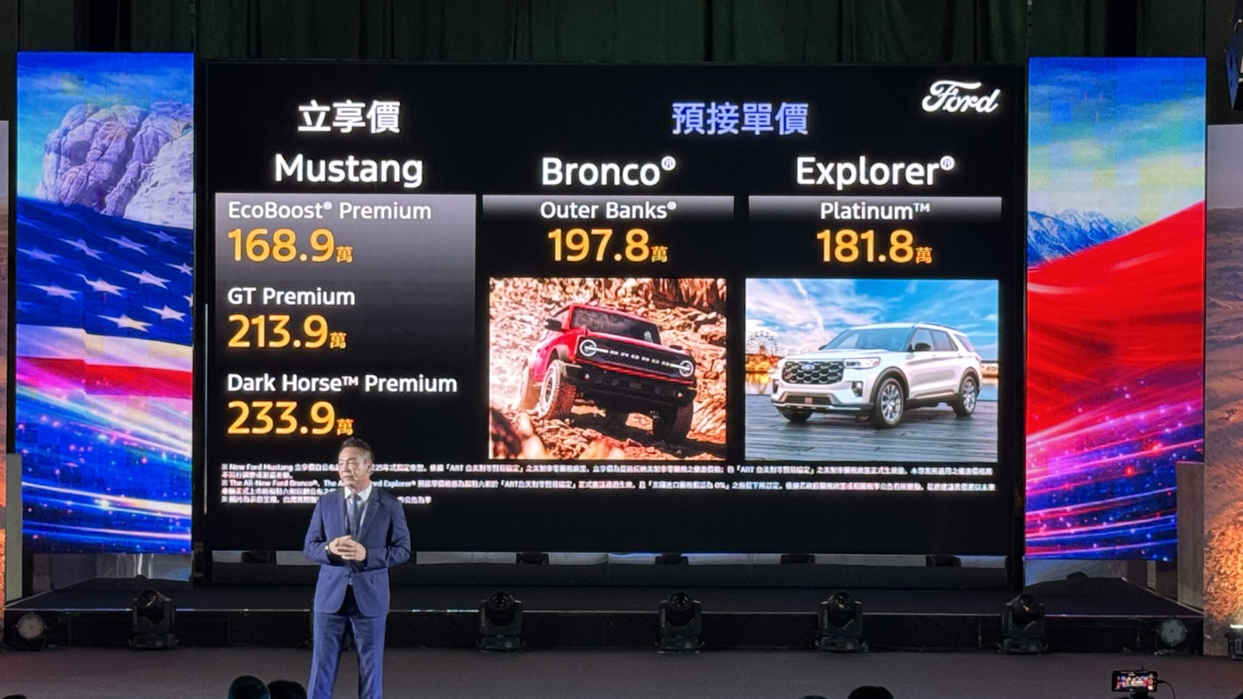 美製車進口關稅歸零所牽動的台灣車價變化,始終受到消費者關注,不少汽車品牌都已針對部分車款進行降價,美國品牌福特在台灣終於有動作了!福特六和在今天舉行記者會宣布,性能跑車野馬New Ford Mustang降價超過20萬,同時將引進越野休旅The All-New Ford Bronco® Outer Banks®以及美式正7人座SUV The All-New Ford Explorer® PlatinumTM,售價都在200萬以內。