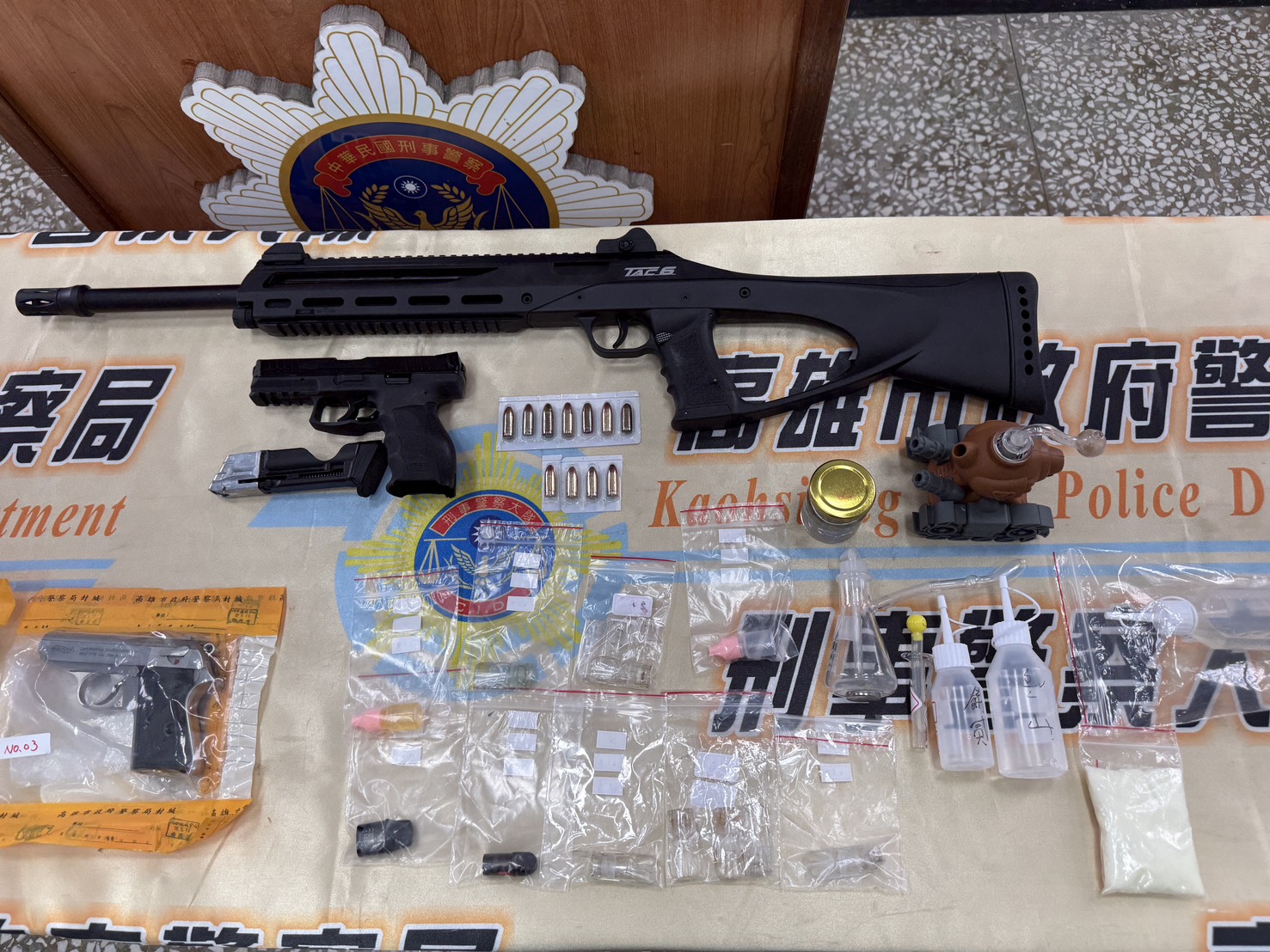 另一路警力則在鼓山區成功攔截徐嫌,在查扣手槍 1 支、子彈 11 顆,以及空氣手槍與空氣長槍各 1 支。毒品部分則搜出安非他命 5 包(共計 18.7 公克)、依托咪酯菸彈 5 顆(共計 37 公克)及菸油 2 瓶(共計 16 公克)。